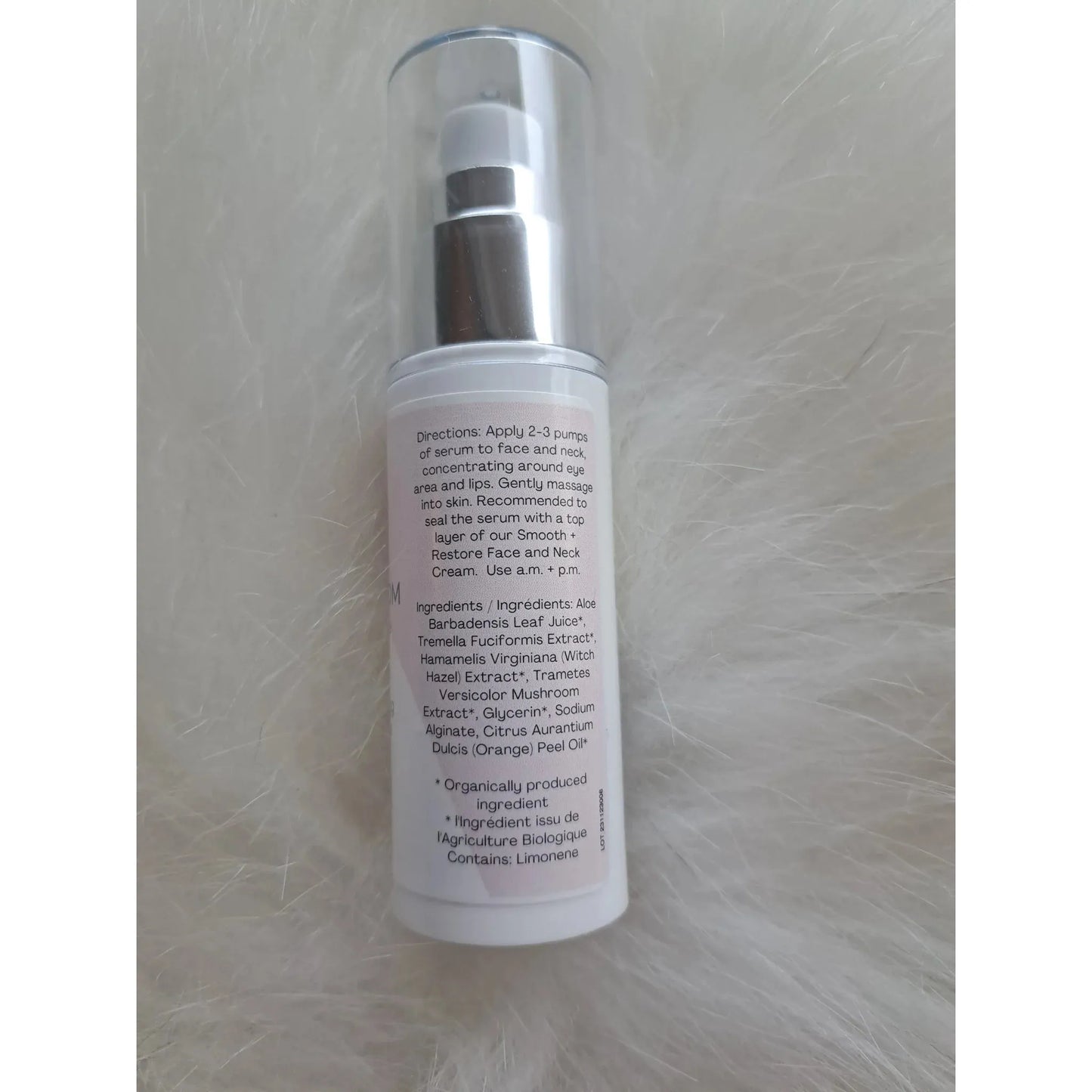 Directions: Apply 2-3 drops of serum to face and neck, concentrating around eye area and lips. Gently massage into skin. Recommended to seal the serum with a top layer of an oil serum of choice and our smooth and restore peptide cream.