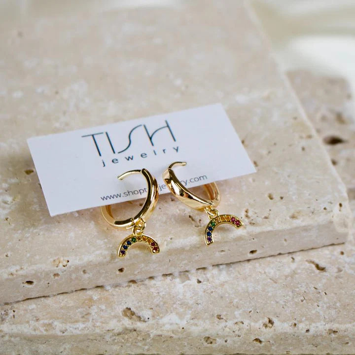 You no longer need to chase the rainbow when you can simply bring the rainbow with you! The Bowie huggie hoops have the cutest rhinestone rainbow charm!